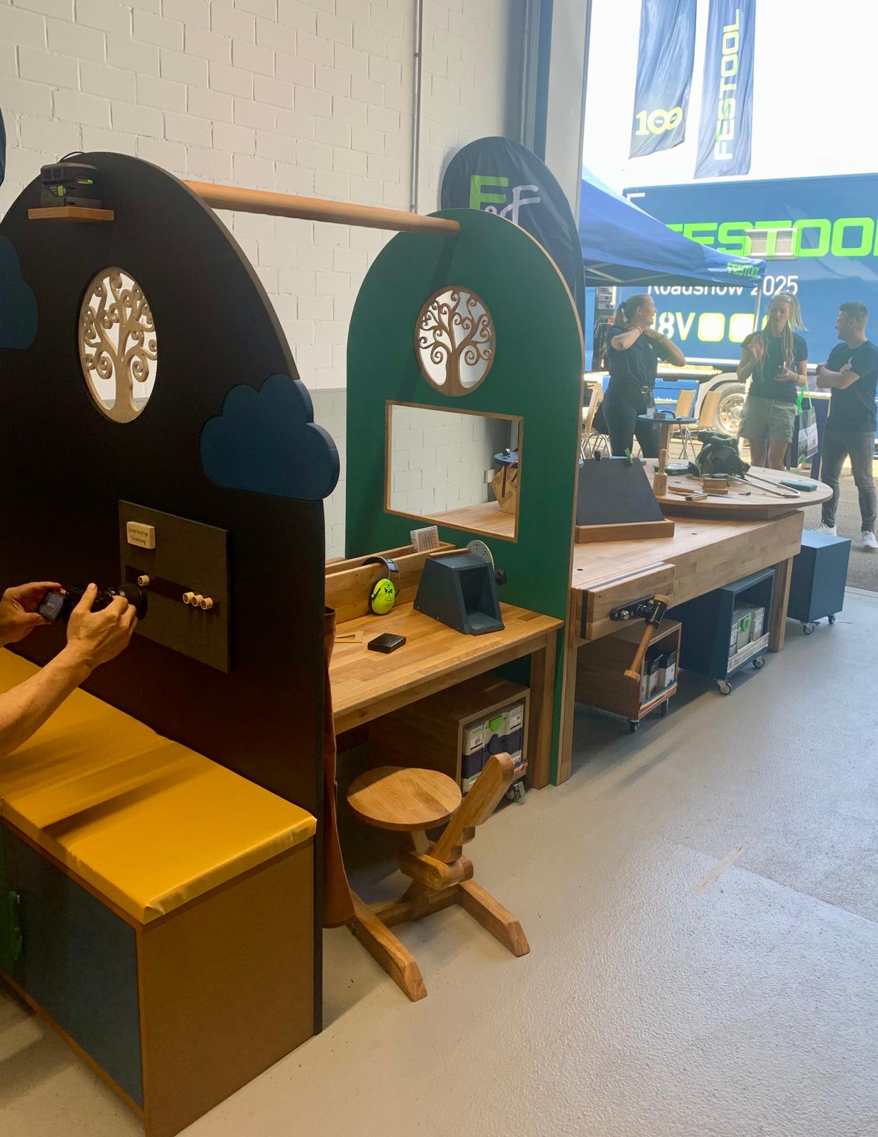Die beteiligten Künstlerinnen und Künstler, allesamt eng mit Festool verbunden, brachten unterschiedliche handwerkliche Hintergründe, Stile und Herangehensweisen mit. Genau diese Vielfalt machte das Projekt so besonders. In einem offenen, kooperativen Arbeitsprozess wurden Ideen entwickelt, verworfen und weitergedacht. Funktionalität, Sicherheit und die Bedürfnisse von Kindern standen dabei stets im Mittelpunkt.